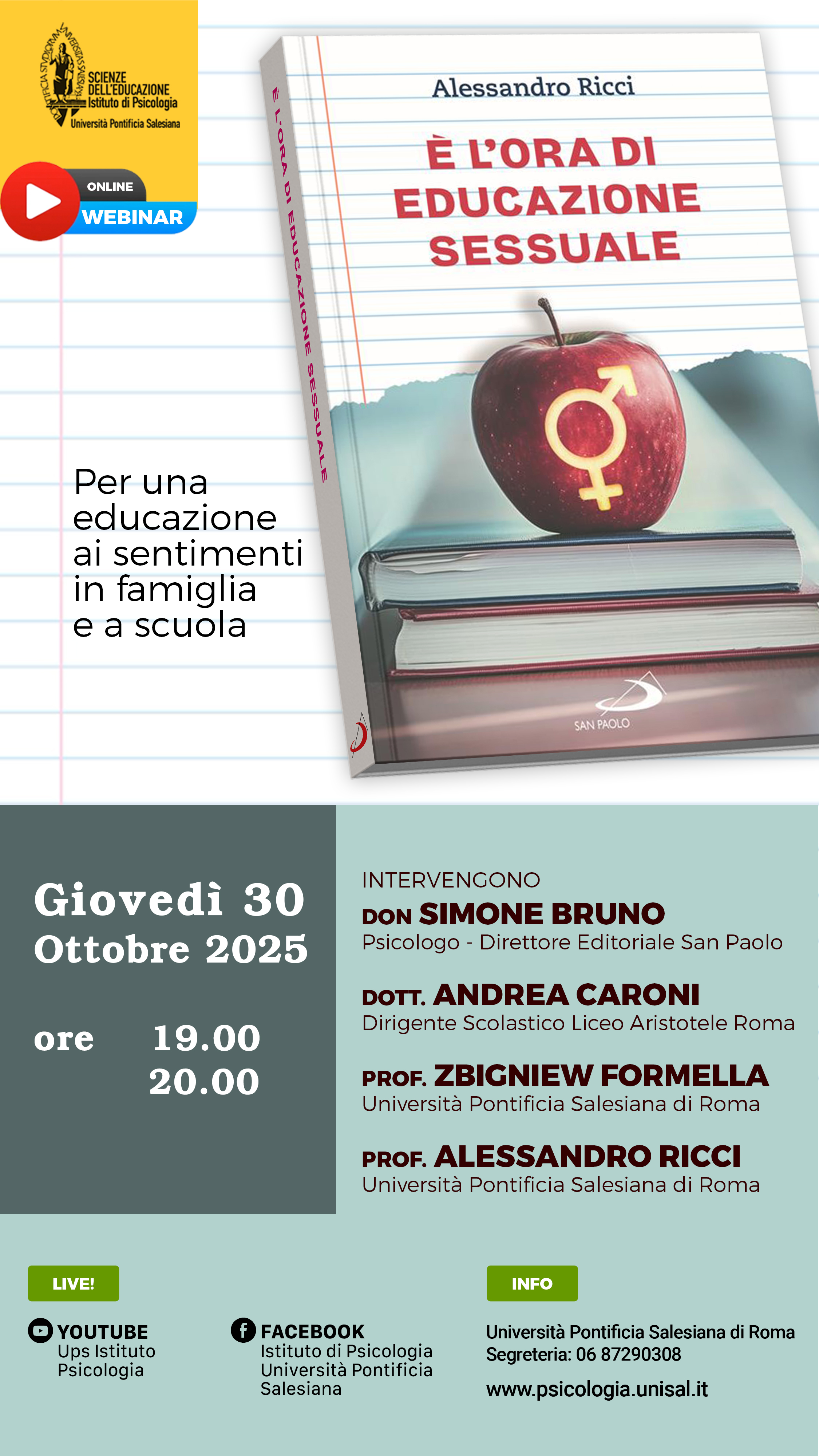 Webinar: E' l'ora di Educazione SessualeIl webinar offrirà un'occasione significativa di approfondimento sul tema dell'educazione ai sentimenti, sia in ambito familiare che scolastico. L'evento è aperto a tutti e visibile in diretta sul canale Youtube dell'Istituto. Online 19:00 - 20:00 |