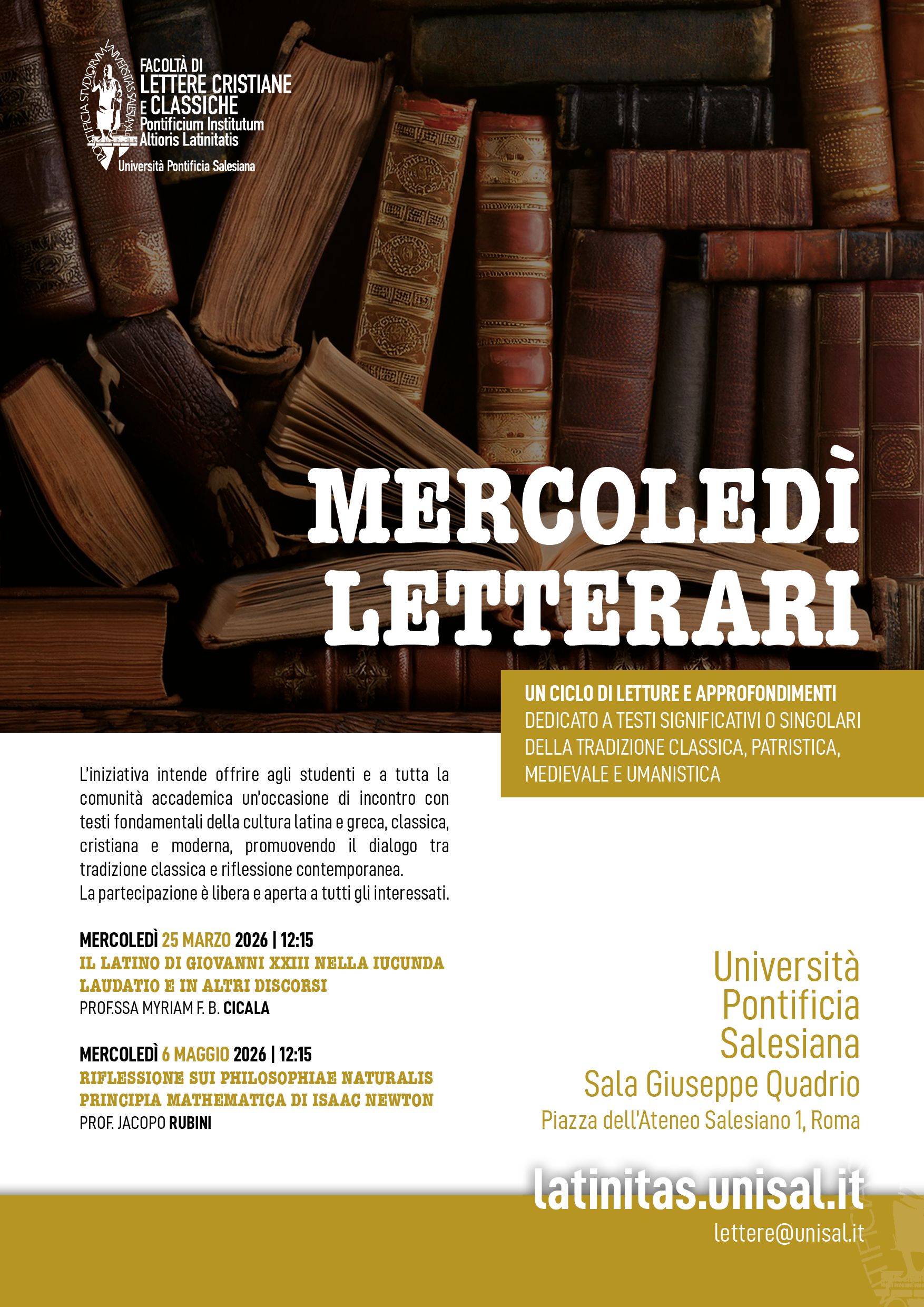 Mercoledì letterari: ciclo di incontri culturali dedicati agli autori classiciLa Facoltà di Lettere Cristiane e Classiche promuove il ciclo dei «Mercoledì Letterari», dedicato ai grandi testi della tradizione umanistica attraverso incontri di lettura e commento. La partecipazione è libera. Sala Giuseppe Quadrio 12:15 |