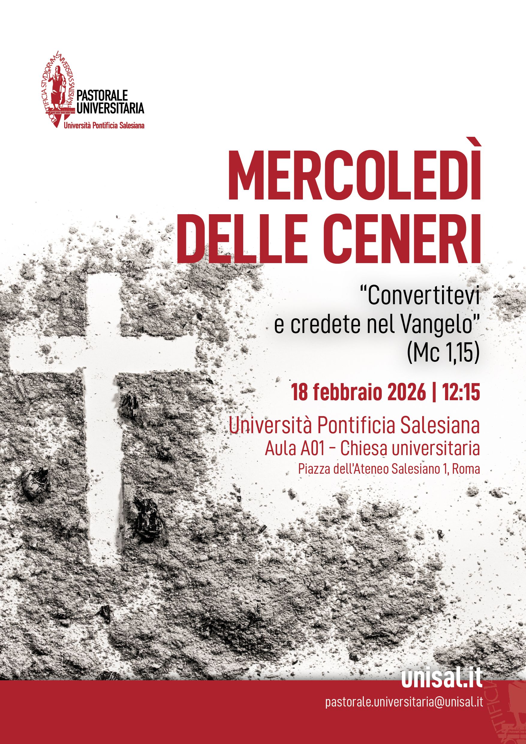 Liturgia delle Ceneri"Convertitevi e credete nel Vangelo" (Mc 1,15) - Celebrazione delle Ceneri Aula A01 - Chiesa universitaria 12:15 |