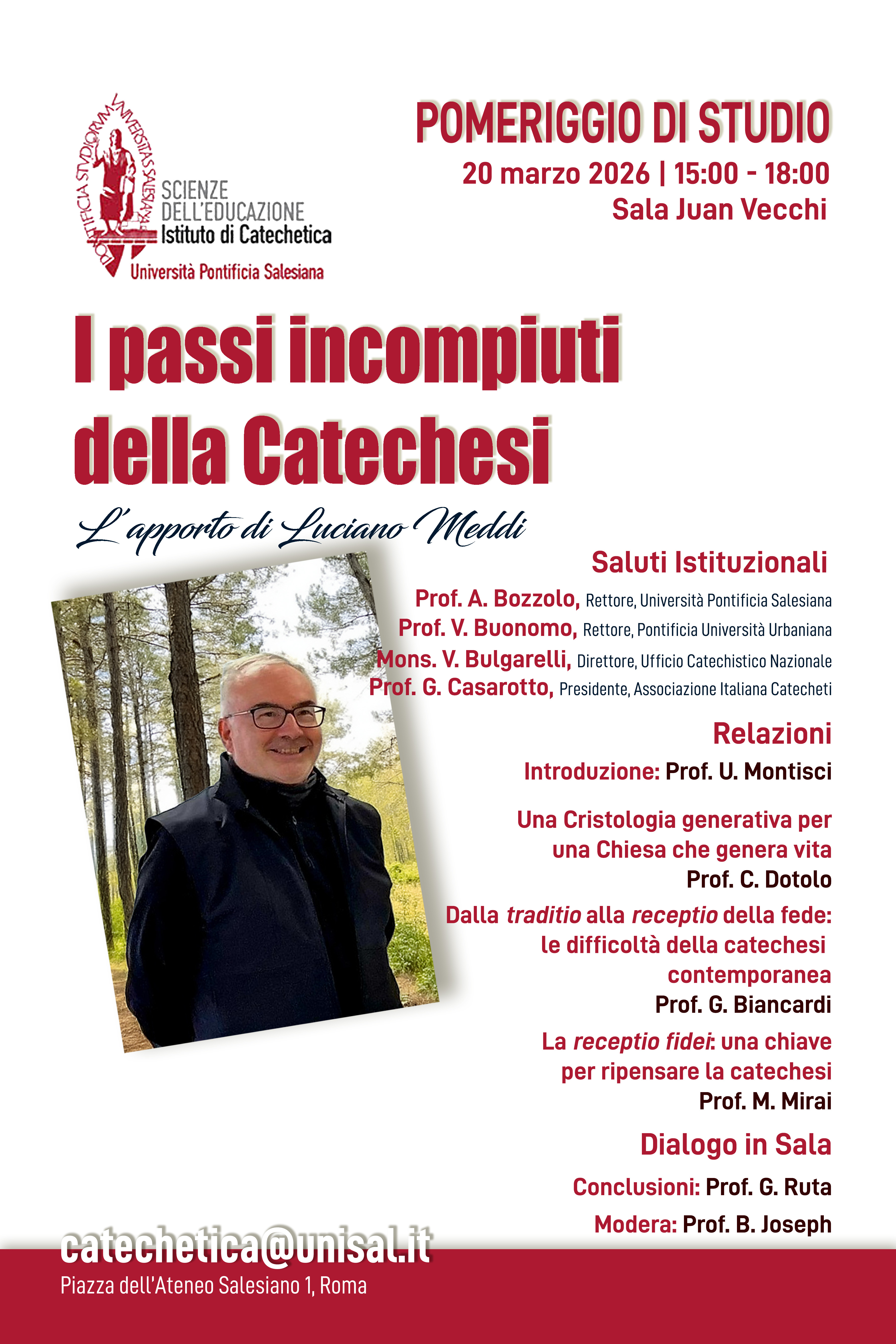 I passi incompiuti della Catechesi: l'apporto di Luciano MeddiL’Istituto di Catechetica promuove un pomeriggio di studio dedicato alla figura e al contributo scientifico del prof. Luciano Meddi, recentemente scomparso. Sala Juan Vecchi 15:00 - 18.00 |