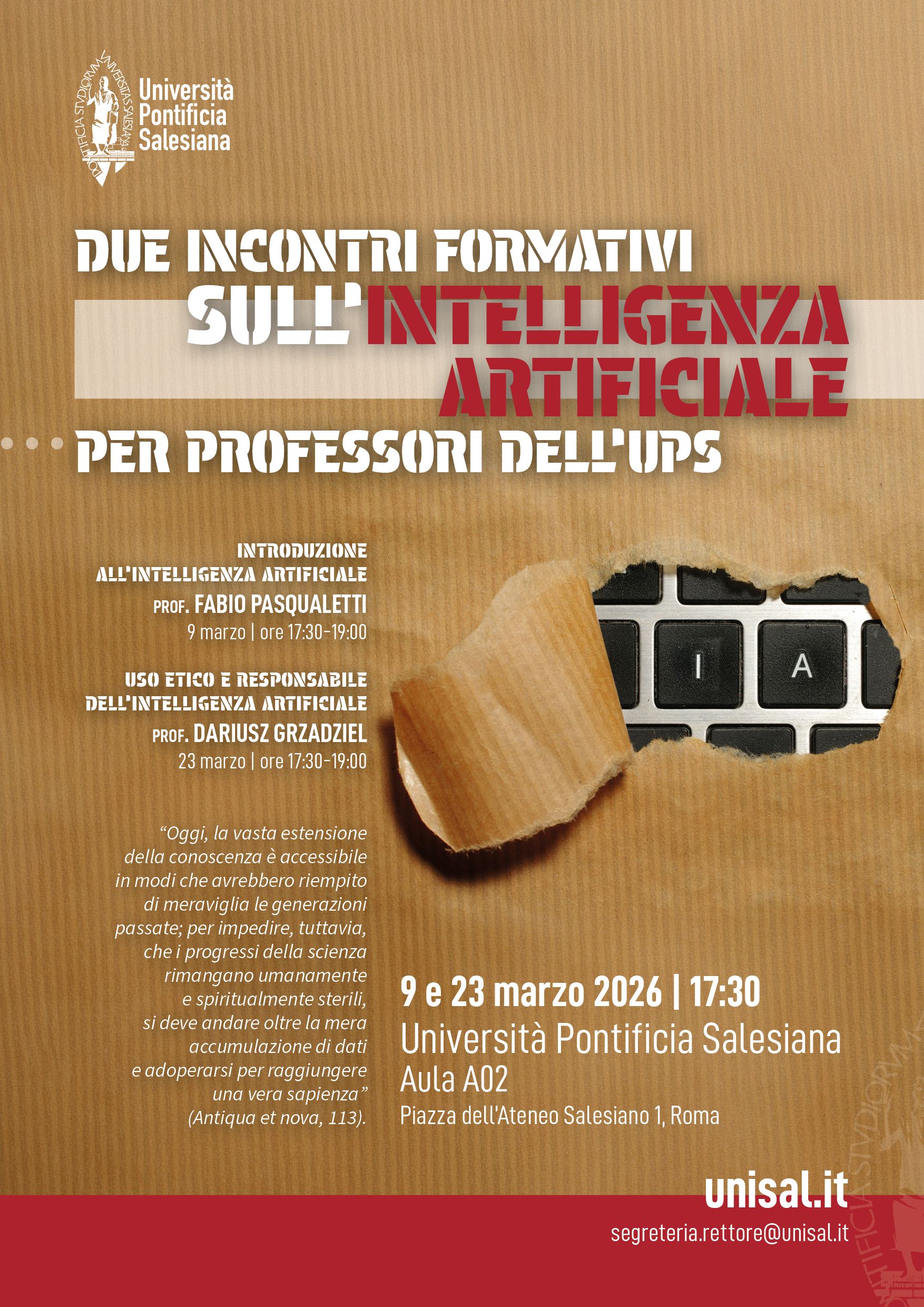 Intelligenza Artificiale: secondo incontro formativo per i docenti UPSIl secondo incontro, Uso etico e responsabile dell’Intelligenza Artificiale, sarà guidato dal prof. Dariusz Grzadziel e affronterà le implicazioni etiche, le responsabilità educative e le buone pratiche per un utilizzo consapevole degli strumenti di IA nella didattica e nella ricerca. Aula A02 17:30 - 19:00 |