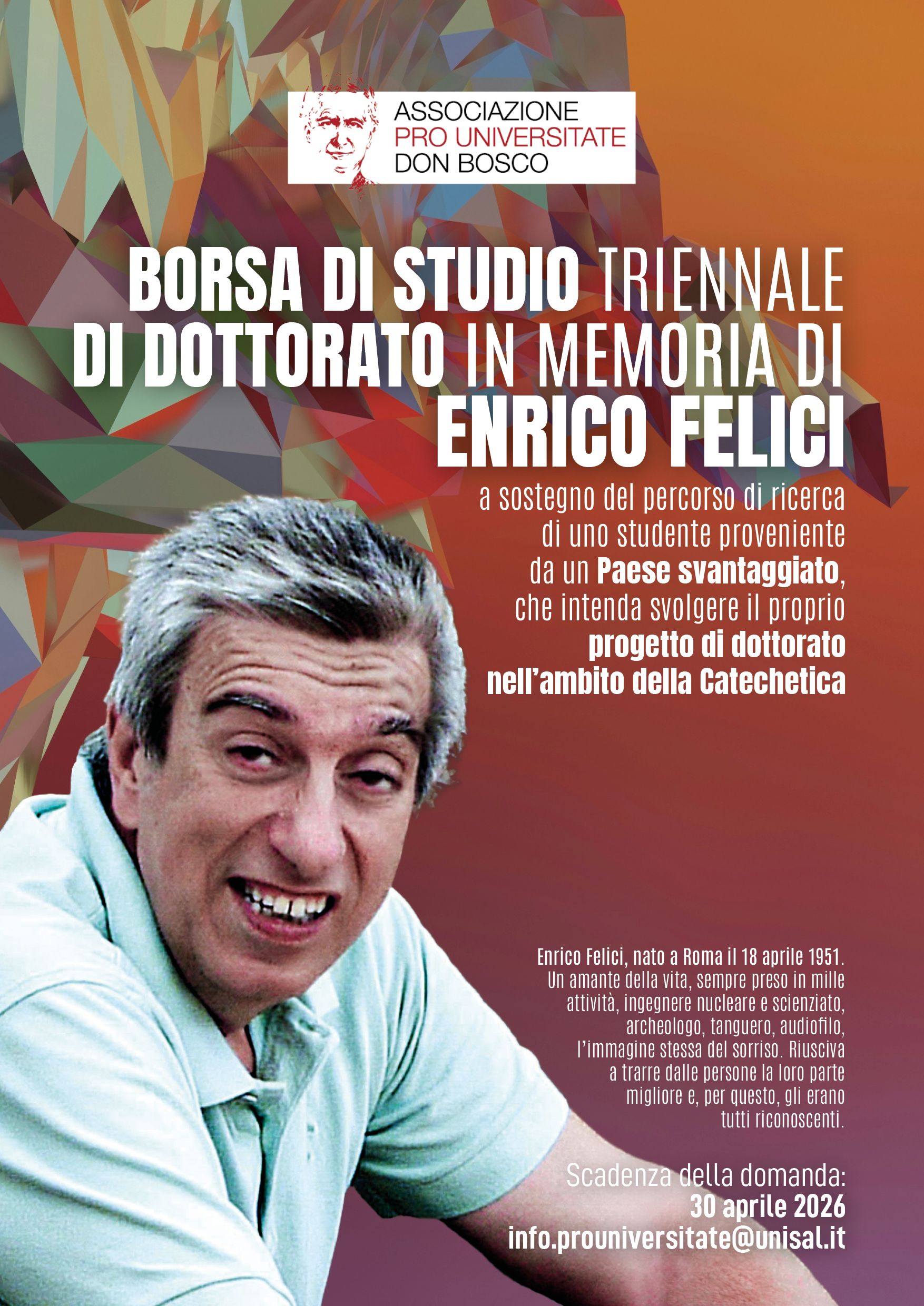 Borsa di studio triennale di Dottorato in memoria di Enrico FeliciTermine per la presentazione delle domande relative al Bando per la Borsa di studio triennale di Dottorato in memoria di Enrico Felici, a sostegno del percorso di ricerca di uno studente proveniente da un Paese svantaggiato, che intenda svolgere il proprio progetto di dottorato nell’ambito della Catechetica. UPS |