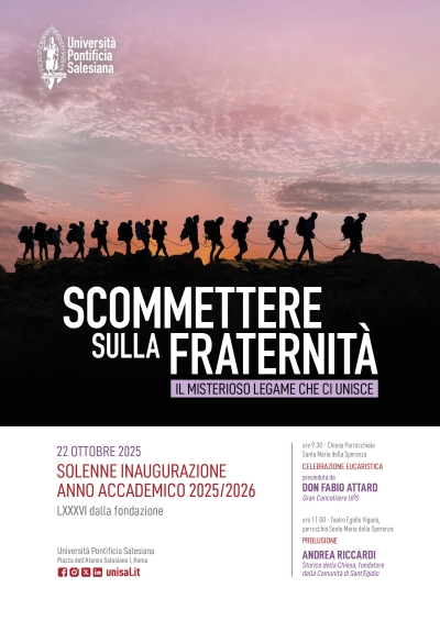 Solenne inaugurazione Anno Accademico 2025/2026Ore 9:30, Celebrazione eucaristica presso la Chiesa parrocchiale di Santa Maria della Speranza. Ore 11:00, Atto accademico inaugurale, presso il Teatro Egidio Viganò, con la relazione introduttiva del Magnifico Rettore, don Andrea Bozzolo, e la Prolusione affidata ad Andrea Riccardi, storico della Chiesa e fondatore della Comunità di Sant’Egidio. Parrocchia Santa Maria della Speranza 9:30 |