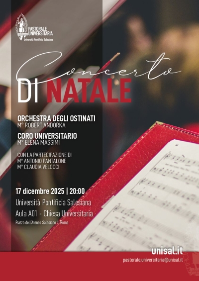 Concerto di Natale del Coro UniversitarioLa Chiesa Universitaria dell'UPS accoglie il tradizionale evento dedicato alla gioia del Natale e all’arrivo delle imminenti festività. L’Accademia degli Ostinati e il Coro Universitario si esibiranno nuovamente insieme, proponendo un repertorio tratto dai grandi maestri della musica internazionale. L’ingresso è gratuito e aperto a tutti. Aula A01 - Chiesa Universitaria 20:00 |