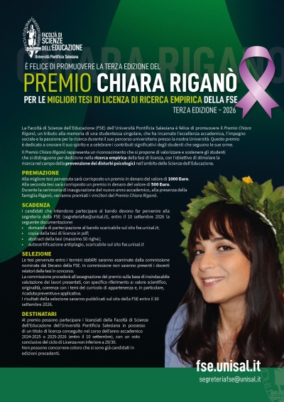 Scadenza Bando – Premio Chiara Riganò 2026È indetta la terza edizione del Premio Chiara Riganò, volto a valorizzare il lavoro degli studenti che, nella redazione della Tesi di Licenza, si sono distinti per l’elevata qualità della ricerca nel campo della prevenzione dei disturbi psicologici. Possono presentare domanda gli studenti della Facoltà di Scienze dell’Educazione che abbiano conseguito il titolo di licenza negli anni accademici 2024/2025 o 2025/2026, con una votazione finale non inferiore a 29/30. |