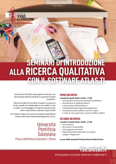 Introduzione alla ricerca qualitativa con il software Atlas.ti: 1° seminarioPrimo seminario di introduzione all’utilizzo del programma Atlas.ti, uno dei principali software dedicati a supportare l’analisi qualitativa nell’ambito della Metodologia della ricerca. Informazioni e iscrizioni: segreteriafse@unisal.it