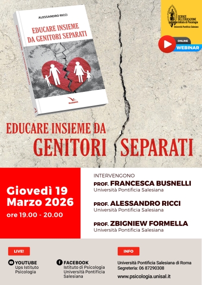 Webinar: Educare insieme da genitori separatiL'Istituto di Psicologia promuove un webinar gratuito dedicato al tema della co-genitorialità dopo la separazione, con l’obiettivo di riflettere su come ridefinire la relazione genitoriale e costruire una collaborazione educativa efficace. Online 19:00 - 20:00 |
