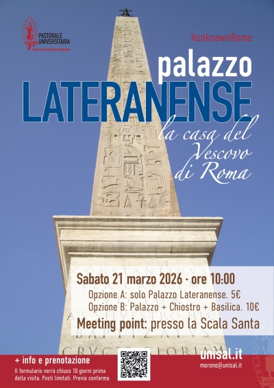 #unknownRome: Visita a Palazzo LateranenseNell'ambito dell'iniziativa #unknownRome, promossa dalla Pastorale Universitaria, un nuovo appuntamento dedicato alla Visita a Palazzo Lateranense, dimora del Vescovo di Roma. 10:00 |