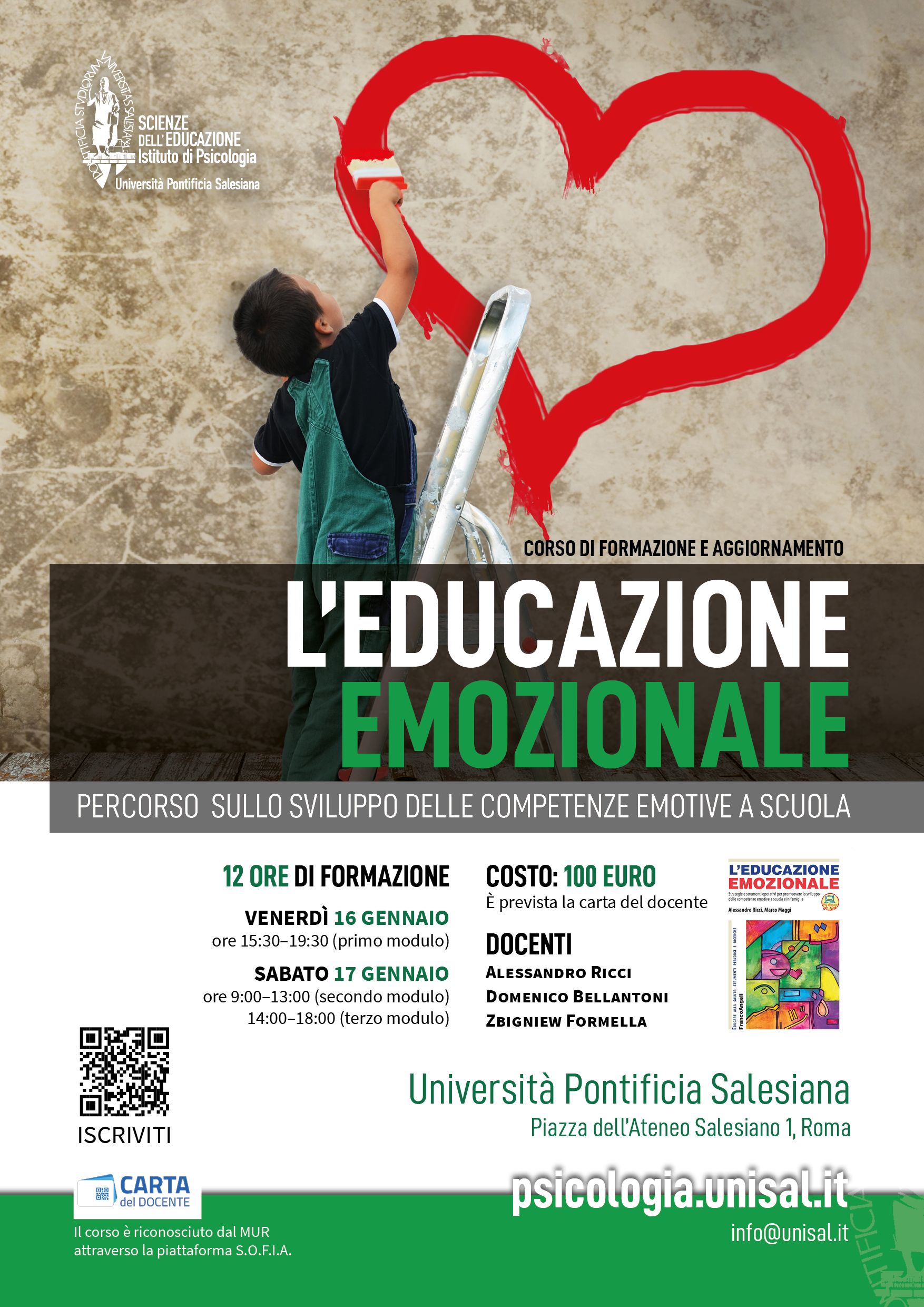 L'Educazione emozionale: Percorso sullo sviluppo delle competenze emotive a scuolaIl corso di formazione e aggiornamento, promosso dall'Istituto di Psicologia, si propone di sviluppare competenze teoriche e pratiche sulle dinamiche emotive e sul loro ruolo fondamentale a scuola. Attraverso un percorso mirato, i partecipanti acquisiranno strumenti concreti per favorire lo sviluppo delle competenze emotive e per intervenire in modo efficace insieme a studenti, insegnanti e famiglie, promuovendo un ambiente scolastico più consapevole e inclusivo. |