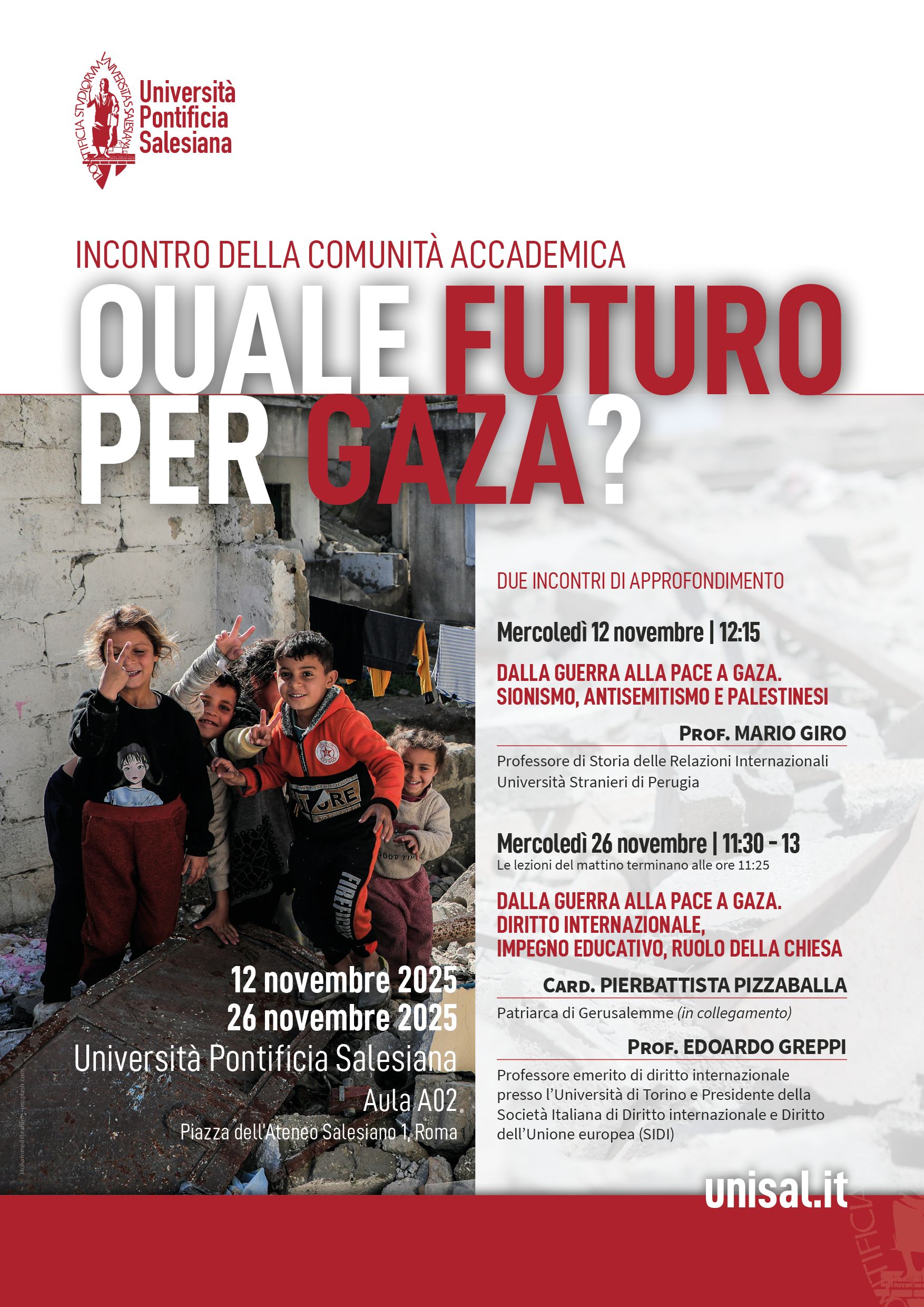 Secondo Incontro della Comunità Accademica: Quale futuro per Gaza?Secondo incontro di approfondimento dal titolo Dalla Guerra alla pace a Gaza. Diritto internazionale, impegno educativo, ruolo della Chiesa. Intervengono: Card. Pierbattista Pizzaballa, Patriarca di Gerusalemme (in collegamento), e Prof. Edoardo Greppi, Professore emerito di diritto internazionale presso l'Università di Torino e Presidente della Società Italiana di Diritto internazionale e Diritto dell’Unione europea (SIDI). Aula A02 11:30 - 13:00 |