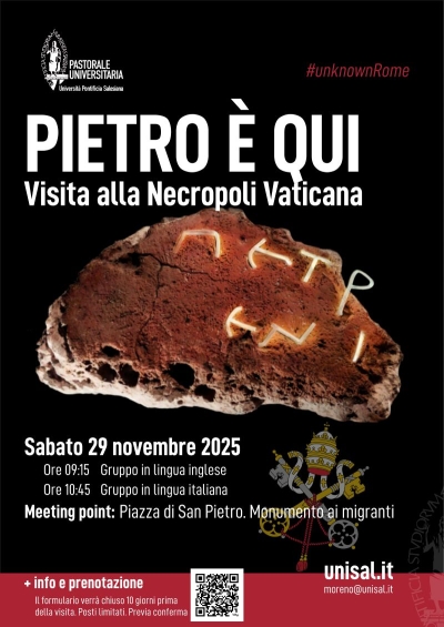 #unknownRome: Visita alla Necropoli Vaticana (Scavi di San Pietro)Nell'ambito dell'iniziativa #unknownRome, promossa dalla Pastorale Universitaria, un nuovo appuntamento dedicato alla visita della Necropoli Vaticana Piazza San Pietro - Monumento ai migranti 9:15 |
