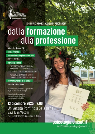 Seminario dei neo ex-allievi di PsicologiaL’Istituto di Psicologia organizza il seminario gratuito Dalla formazione alla professione, un momento di incontro e confronto dedicato ai neo ex-allievi di Psicologia: un’occasione per condividere esperienze, orientarsi nel mondo professionale e rafforzare il legame con la comunità accademica. Sala Juan Vecchi 9:00 |